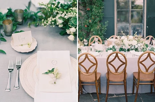 Photography: Cory + Jackie | Design, Styling and Floral: Isibeal Studio | Cake and Pastry: Gallery Pastry Shop | Paperie: Layers of Loveliness | Rentals (linens, flatware, glassware, tables): A Classic Party Rental | Rentals: (chairs, place settings, plates, sofa): Violet Vintage | Specialty Tabletop Rentals (mother of pearl flatware, glassware): Realm Living | Hair and Makeup: Megan Grimm | Bride: Chung Chow, Amax Talent | Groom: Peyton Allen, Talent Fusion Agency | Gown: Carol Hannah | Shoes: Bella Belle Shoes | Rings: Vinny & Charles | Groom suit: Cafe Brown Notch Lapel Suit from Stitch & Tie | Production: Ruffled